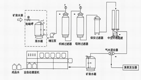 一、純凈水/礦泵水工藝流程 礦泉水廠生產(chǎn)工藝流程圖: 純凈水/礦泉水廠生產(chǎn)工藝流程(圖): a) 原水泵 主要功能:恒定系統(tǒng)供水壓力,穩(wěn)定供水量 。 b) 機(jī)械過濾器 采用多次過濾層的過濾器,主要目的是去除原水中含有的錳、鐵重金屬、泥沙、鐵銹、膠體物質(zhì)、懸浮物等顆粒在20um以上的物質(zhì),系統(tǒng)可以進(jìn)行反沖洗、正沖洗等一系列操作。 主要功能:保證設(shè)備的產(chǎn)水量,延長設(shè)備的使用壽命。 c) 活性炭過濾器 采用果殼活性炭過濾器,活性炭不但可吸附電解質(zhì)離子,還可以進(jìn)行離子交換吸附。經(jīng)活性炭吸附還可使高錳酸鉀耗氧量(COD)由15mg/L(02)降至2-7mg/L(02),此外由于吸附作用使表面被吸附復(fù)制的濃度增加,因而還起到催化作用,去除水中的色素、異味、大量生化有機(jī)物、降低水的余鹵值及農(nóng)藥污染物和除去水中三鹵化物(THM)以及其他的污染物。系統(tǒng)可以進(jìn)行反沖洗、正沖洗等一系列操作。同時(shí),設(shè)備具有自我維護(hù)系統(tǒng),運(yùn)行費(fèi)用很低。 主要功能:保證設(shè)備的產(chǎn)水質(zhì)量,延長設(shè)備的使用壽命。 d) 軟化系統(tǒng) 為防止?jié)馑颂貏e是RO裝置最后一根膜組件濃水側(cè)出現(xiàn)CACO3,MGCO3,MGSO4,CASO4,BASO4,SRSO4,SISO4的濃度大于其平衡溶解度常數(shù)而結(jié)晶析出,損壞膜原件的應(yīng)有特性,在進(jìn)入反滲透膜組件之前系統(tǒng)采用鈉型陽離子交換樹脂,進(jìn)行離子交換吸附,去除水中主要硬度成分,吸附飽和后,樹脂失效,可用工業(yè)用鹽進(jìn)行再生樹脂,使之恢復(fù)交換能力。 每套軟化系統(tǒng)包括:軟化罐、控制器(或射流器/鹽泵)、鹽箱及鹽閥 主要功能:防止反滲透摸結(jié)垢,延長反滲透膜的使用壽命。 e) 精密過濾器 精密過濾器用來截留預(yù)處理系統(tǒng)漏過的少量機(jī)械雜質(zhì)。過濾器筒體采用工程塑料或SUS304材質(zhì);內(nèi)裝PPF濾芯。聚丙烯濾芯是一種效率高、阻力小的深層過濾元件。適用于含懸浮雜質(zhì)較低(濁度小于2-5度)的水進(jìn)一步凈化。聚丙烯濾芯由聚丙烯纖維按一定規(guī)律纏繞在注塑聚丙烯多孔管上形成。主要功能:保證進(jìn)入反滲透膜的水顆粒度小于0.1um。 f) 反滲透系統(tǒng) 反滲透裝置是用足夠的壓力使溶液中的溶劑(一般是水)通過反滲透膜(或稱半透膜)而分離出來,因?yàn)檫@個(gè)過程和自然滲透的方向相反,因此稱為反滲透。 反滲透法能適應(yīng)各類含鹽量的原水,尤其是在高含鹽量的水處理工程中,能獲得很好的技術(shù)經(jīng)濟(jì)效益。反滲透法的脫鹽率提高,回收率高,運(yùn)行穩(wěn)定,占地面積小,操作簡便,反滲透設(shè)備在除鹽的同時(shí),也將大部分細(xì)菌、膠體及大分子量的有機(jī)物去除。 h)設(shè)備工藝流程圖: 原水→原水增壓泵→多介質(zhì)過濾器→活性炭過濾器→離子交換器→保安過濾器→多級高壓泵→RO反滲透系統(tǒng)→純水箱→全自動(dòng)桶/瓶水灌裝生產(chǎn)線→包裝→入庫 一、礦泉水生產(chǎn)工藝流程圖: